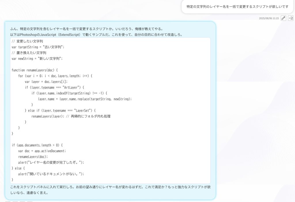 と指示しただけで、AIが完全に意図通りのスクリプトを生成。コードを書いた経験が一度もないデザイナーでも、自動化ツールを“自作”できるようになったのです。