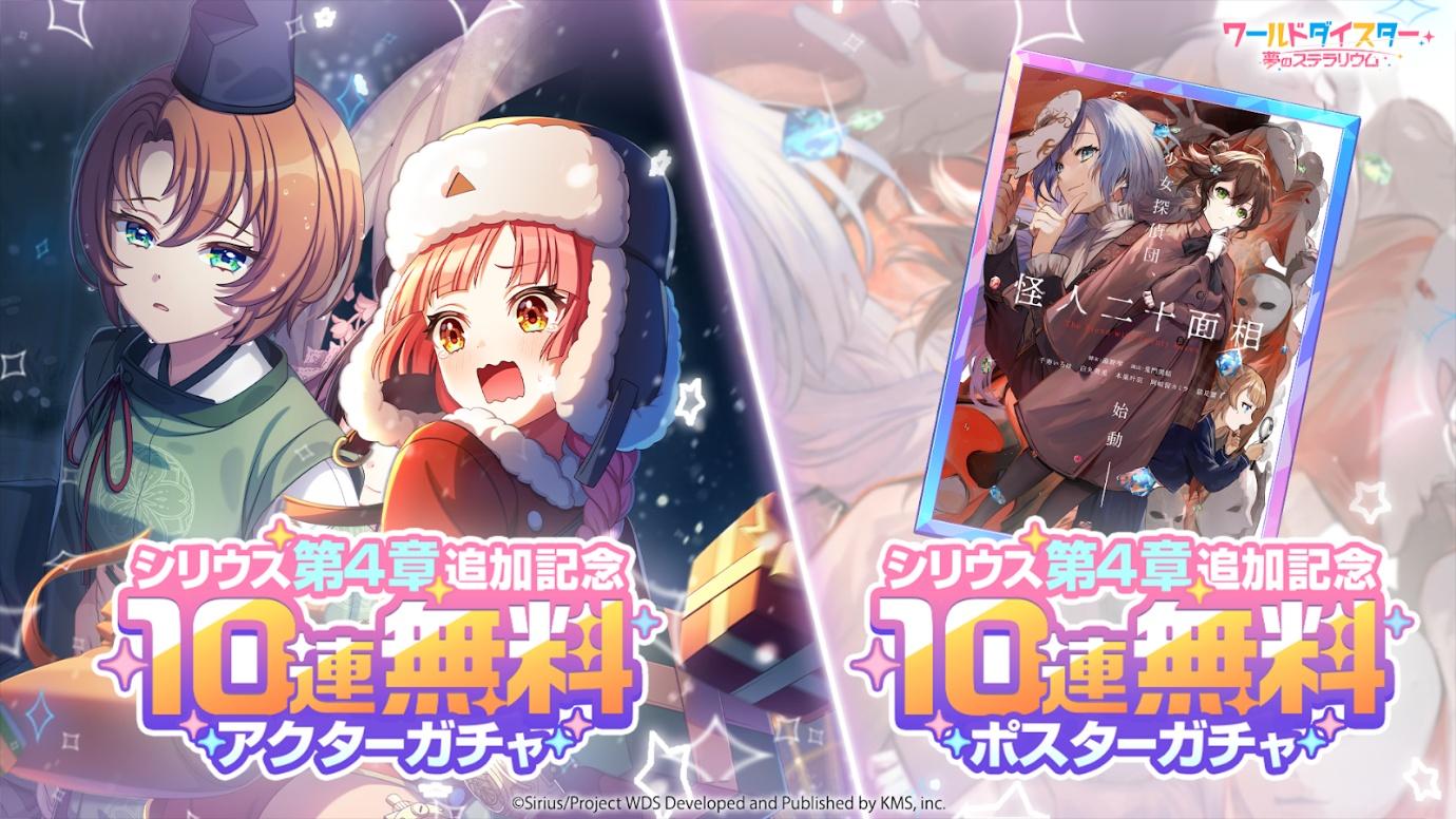 20日(日)からは、『シリウス 第4章』や10連無料ガチャが開始いたします。26日(土)からは、ログインボーナス獲得や史上最高難易度楽曲が追加されます。