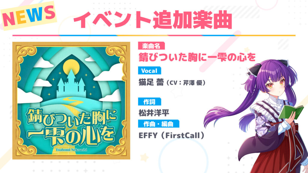 猫足蕾が歌う「錆びついた胸に一雫の心を」も新楽曲として登場いたします。